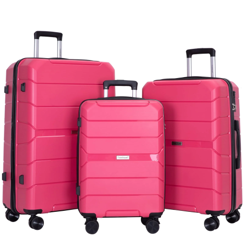 حقيبة صلبة بعجلات دوارة من البولي بروبيلين، حقيبة متينة خفيفة الوزن مع قفل TSA، مجموعة من 3 قطع (20/24/28)، وردي